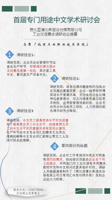 首届专门用途中文学术研讨会的成功举办,为我校进一步推进“中文+职业技能”明晰了方向,也为我校继续办好中赞职业技术学院和孔子课堂增添了动力,更为我校未来申办“中文+职业教育”项目基地开拓了新思路。
